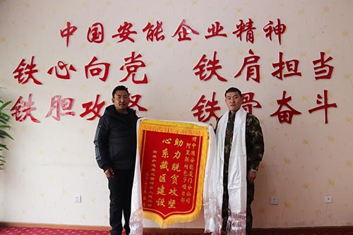 3月底,薩嘎縣達吉嶺鄉(xiāng)派出所營區(qū)計劃進行整體硬化,但由于當?shù)亟ㄔO(shè)經(jīng)費緊張,一直未能批復(fù)。何樂鋒在了解當?shù)氐睦щy后,主動為他們捐贈了20噸水泥,解決了他們建設(shè)的燃眉之急,有效改善了派出所的辦公生活條件。嶺鄉(xiāng)派出所所長旦增扎巴專程來到項目部,為全體人員獻上潔白的哈達,為項目部贈送了印有“心系藏區(qū)建設(shè),助力脫貧攻堅”內(nèi)容的錦旗和感謝信,“中國安能為我們幫了大忙,建設(shè)阿里聯(lián)網(wǎng)工程為我們送電,為我們解決務(wù)工難題,還支持我們建設(shè),我受我們鄉(xiāng)書記委托,專程過來感謝你們,我們達吉嶺鄉(xiāng)全鄉(xiāng)人民都感謝你們!”他緊握項目經(jīng)理何樂峰的雙手,動情地說道。