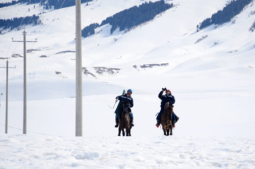 阿曼吐爾·依沙木丁帶領(lǐng)供電所員工冬季騎馬巡視天山腳下的供電線路。(國網(wǎng)伊犁伊河供電公司供圖)