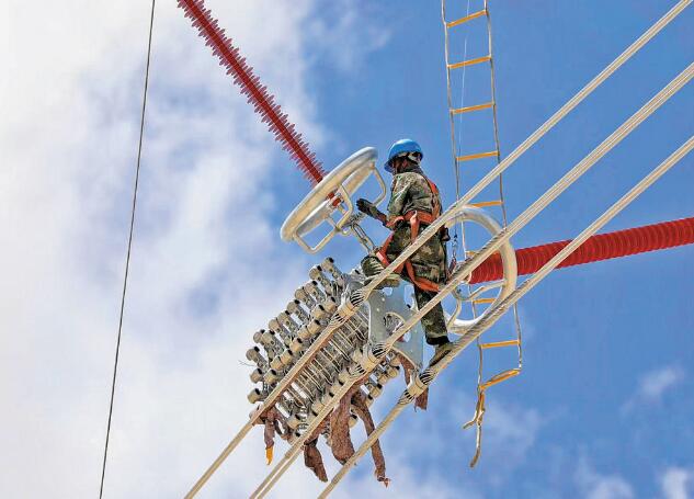 黨員在750千伏青海郭隆—甘肅武勝第三回線路工程(青海段)安裝附件。 鄒建華 攝