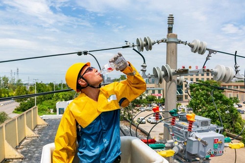 國網(wǎng)山東濟(jì)寧供電公司員工在烈日高溫下完成智能開關(guān)更換作業(yè)后補(bǔ)充水分。
