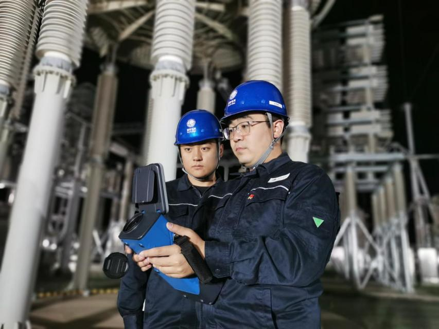 國(guó)網(wǎng)冀北超高壓公司員工在±500千伏換流站進(jìn)行夜間直流穿墻套管紫外放電檢測(cè)試驗(yàn)。
