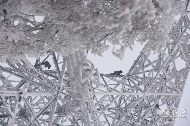 2024年1月,湖北送變電公司員工在湖北隨州市廣水市海拔800多米的牛脊山±800千伏陜武線高空除冰保供電。