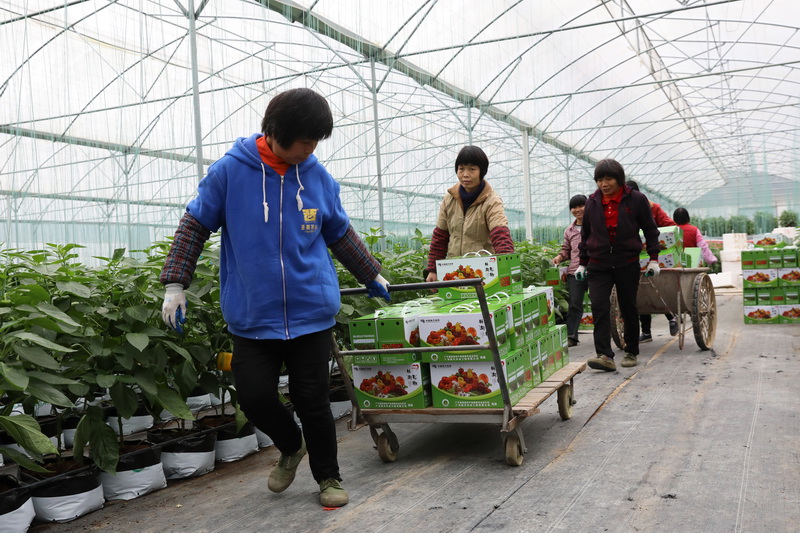 大棚種植基地迎來(lái)豐收喜悅,小婷媽媽和高鋒一起搬運(yùn)豐收的彩椒。孫嘉彪 攝