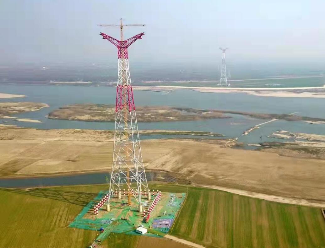 2021年12月28日,在湖北省鐘祥市磷礦鎮(zhèn)、鐘祥市豐樂(lè)鎮(zhèn)漢江之畔,歷經(jīng)50余天的建設(shè),由國(guó)網(wǎng)湖北送變電工程有限公司承建的白鶴灘~江蘇±800千伏特高壓直流輸電線路工程(鄂7標(biāo)段)鐘祥漢江大跨越兩基跨越塔N5044 、N5045組立完成。(李健波、郭暉 攝)