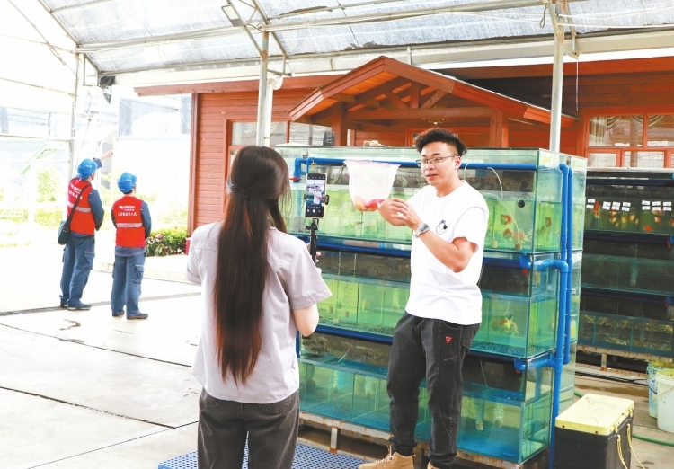 廣東省佛山市南海區(qū)里水鎮(zhèn)擁有全國最大的觀賞魚養(yǎng)殖產(chǎn)銷基地,近200家錦鯉養(yǎng)殖企業(yè)在此落戶,八成從事電商銷售。“這是我們今年賣得最好的紅白品種,體形流暢粗壯,墨質(zhì)醇厚有光澤。”廣東惠和錦錦鯉養(yǎng)殖公司主播黃小姐正在直播間介紹著“6·18”促銷活動(dòng)。