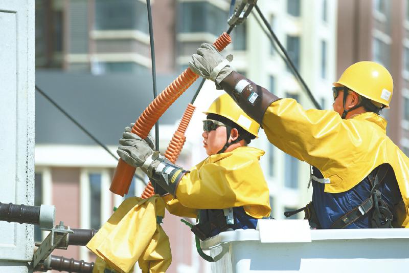 國(guó)網(wǎng)綿陽(yáng)供電公司電力工人正進(jìn)行帶電作業(yè),保障夏季電力供應(yīng)。田海 攝