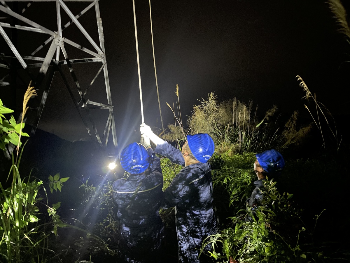 4月20日晚,南方電網廣西新電力集團岑溪供電公司搶修人員在山間開展35千伏大歸線20號塔C相絕緣子遭雷擊脫落接地故障搶修工作。通訊員 韋銳 攝