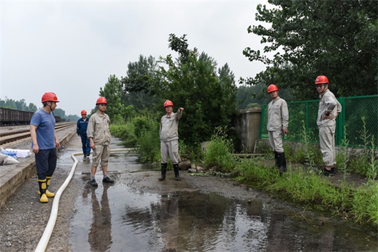10時(shí)30分,新增的三臺(tái)排水泵及排水管送達(dá)翻車機(jī)區(qū)域,檢修人員迅速安裝后“馬力全開(kāi)”開(kāi)始排水。中午12時(shí),傾盆大雨間,廠長(zhǎng)江高潮與設(shè)備部、發(fā)電部、維護(hù)部機(jī)務(wù)車間、維護(hù)部電務(wù)車間負(fù)責(zé)人堅(jiān)守翻車機(jī)區(qū)域,現(xiàn)場(chǎng)坐鎮(zhèn)指揮,指導(dǎo)遷車臺(tái)排水工作。