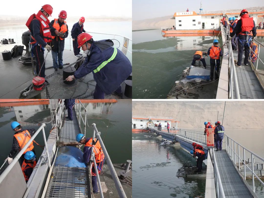 14日上午8時,該公司黨委副書記、總經(jīng)理王學民帶隊趕赴現(xiàn)場,查看泵船及浮橋受損情況,召開現(xiàn)場緊急會議,制定搶修方案,科學合理部署各項工作,同時成立搶修組、物資保障組、后勤組,全力確保取水管線搶修與2號機組檢修工作兩不誤。但由于浮橋過道窄,又非地面作業(yè),無法借助外力,局部應(yīng)力無法釋放,只能通過人力牽引錨繩校正浮箱位置;由于浮橋受力側(cè)堆積大量浮冰,搶修人員只能手持破冰利器,一點一點破碎浮冰,給搶修工作帶來了極大挑戰(zhàn)。面對困難,黨員干部敢于亮劍,沖鋒在前,帶領(lǐng)職工群眾奮戰(zhàn)在搶修一線。