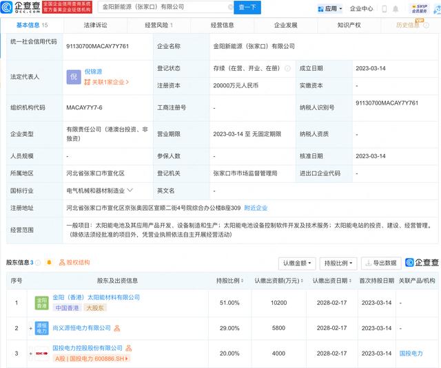 企查查APP顯示,近日,金陽新能源(張家口)有限公司成立,法定代表人為倪錦源,注冊資本2億元人民幣,經(jīng)營范圍包含:太陽能電池及其應(yīng)用產(chǎn)品開發(fā)、設(shè)備制造和生產(chǎn);太陽能電池設(shè)備控制軟件開發(fā)及技術(shù)服務(wù);太陽能電站的投資、建設(shè)、經(jīng)營管理。企查查股權(quán)穿透顯示,該公司由國投電力等共同持股。