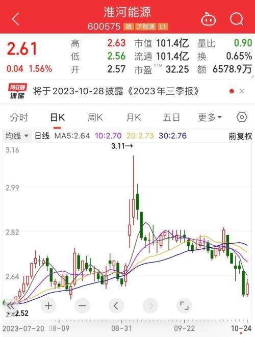 10月24日,淮河能源報(bào)收2.61元/股,漲幅1.56%,總市值為101億元。