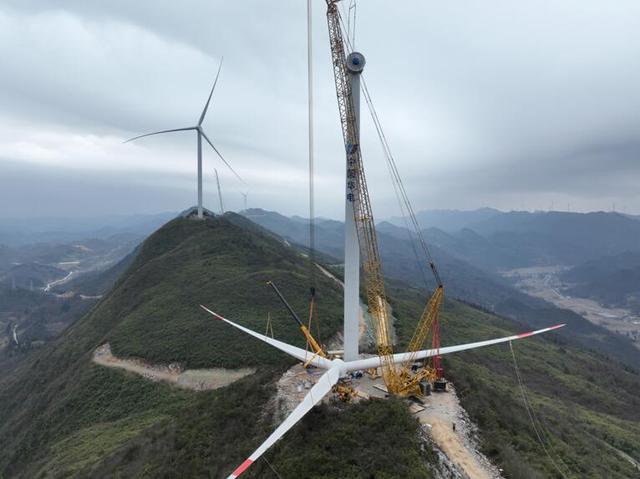 春風(fēng)徐徐,綠能奔涌。3月29日,位于石柱縣南部的萬(wàn)寶二期風(fēng)電項(xiàng)目現(xiàn)場(chǎng)大干快干,機(jī)械轟鳴、塔吊高聳,工人緊張有序奮戰(zhàn)首臺(tái)風(fēng)機(jī)塔筒吊裝。