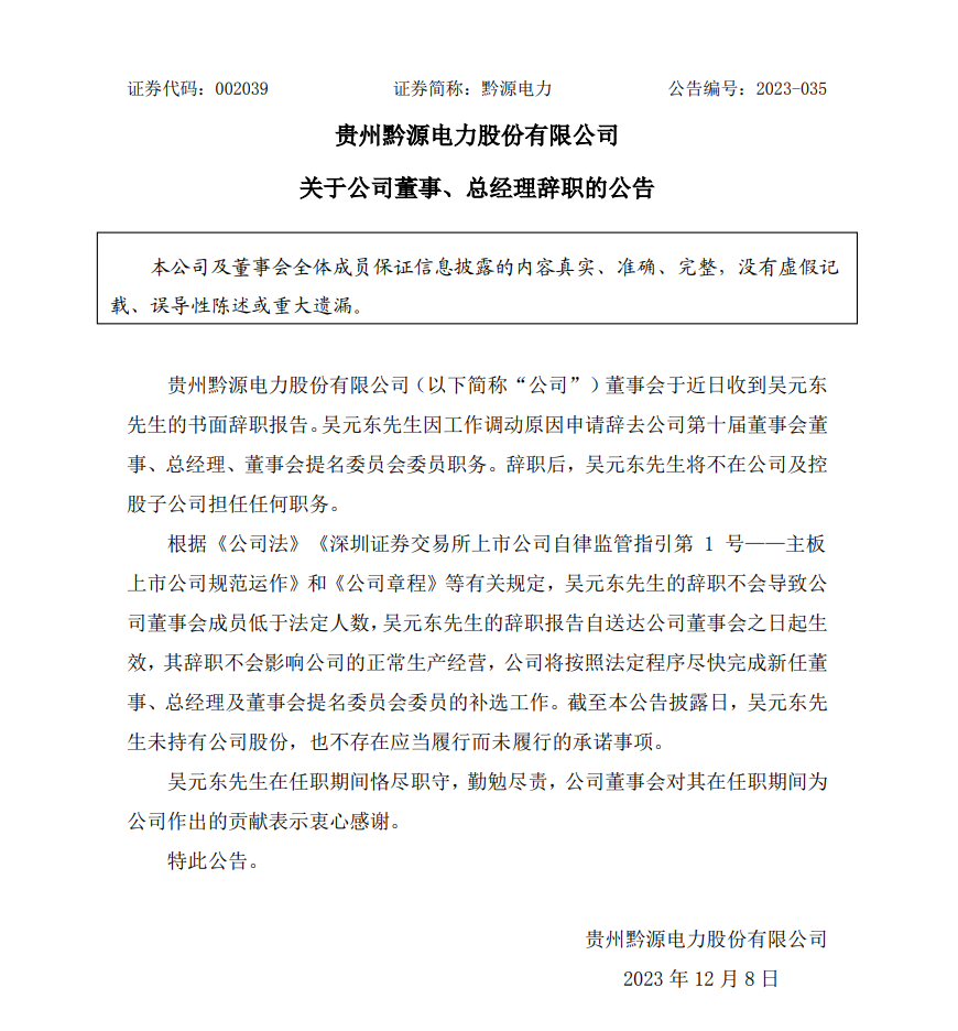 黔源電力12月8日發(fā)布公告稱,公司董事會于近日收到吳元東先生的書面辭職報告。吳元東先生因工作調(diào)動原因申請辭去公司第十屆董事會董事、總經(jīng)理、董事會提名委員會委員職務。辭職后,吳元東先生將不在公司及控股子公司擔任任何職務。