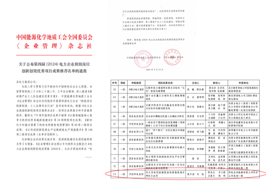 近日,從中國能源化學地質(zhì)工會獲悉,華電吉林公司大安風水山風電場班組成果“風力發(fā)電機組新型齒輪箱散熱翅片研究與應(yīng)用”榮獲中國能源化學地質(zhì)工會第四屆(2024)電力企業(yè)班組崗位創(chuàng)新創(chuàng)效優(yōu)秀項目成果一級獎。