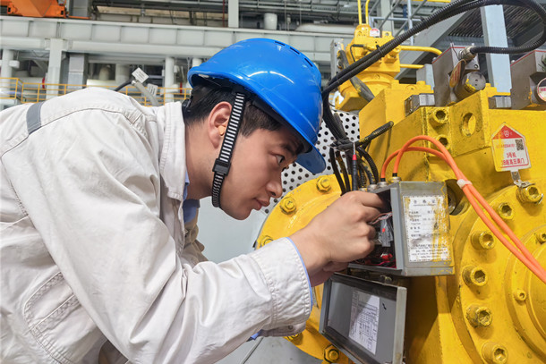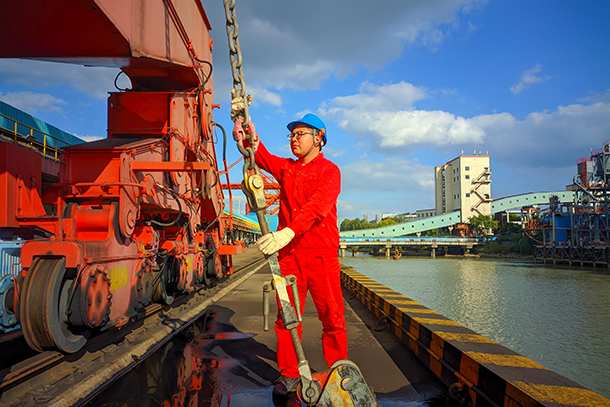 圖為燃料維護(hù)人員在檢查卸船機(jī)防風(fēng)纜