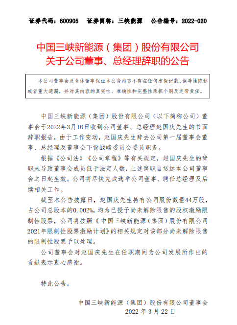 3月21日,三峽能源發(fā)布公告稱,公司董事會(huì)于3月18日收到公司董事、總經(jīng)理趙國慶的書面辭職報(bào)告,由于工作變動(dòng),趙國慶先生辭去公司第一屆董事會(huì)董事、總經(jīng)理及董事會(huì)下設(shè)戰(zhàn)略委員會(huì)委員職務(wù)。