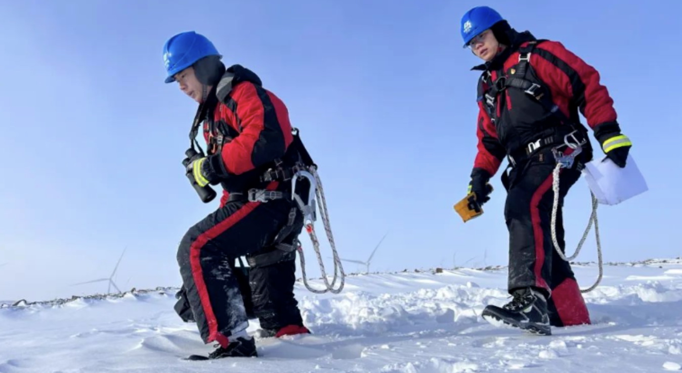 在最高氣溫只有零下26攝氏度河北張家口沽源縣,華電冀北新能源馳盛風(fēng)電場(chǎng)的運(yùn)維員工,冒著寒風(fēng)對(duì)輸配電線(xiàn)路進(jìn)行特巡,及時(shí)啟動(dòng)極寒天氣應(yīng)急預(yù)案,通過(guò)“可視化+無(wú)人機(jī)+人工巡檢”的方式,開(kāi)展線(xiàn)路及站內(nèi)設(shè)備特巡,加強(qiáng)設(shè)備監(jiān)控和消缺。