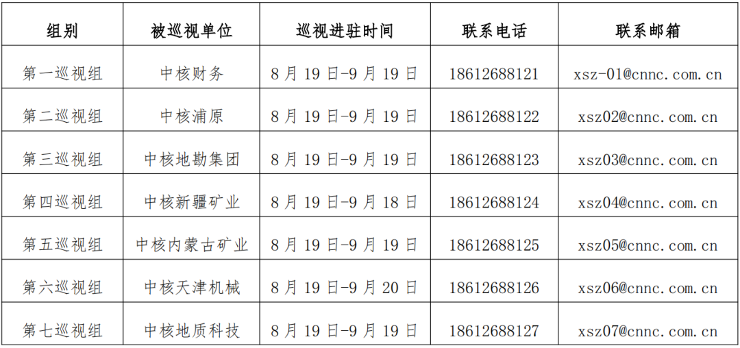 根據(jù)中核集團(tuán)黨組巡視工作統(tǒng)一部署,8月19日,黨組第一至第七巡視組分別進(jìn)駐中核財(cái)務(wù)有限責(zé)任公司、上海中核浦原有限公司、中核地質(zhì)勘查集團(tuán)有限公司、中核新疆礦業(yè)有限公司、中核內(nèi)蒙古礦業(yè)有限公司、中核(天津)機(jī)械有限公司、中核地質(zhì)科技有限公司等7家單位并召開巡視工作動(dòng)員會(huì)。
