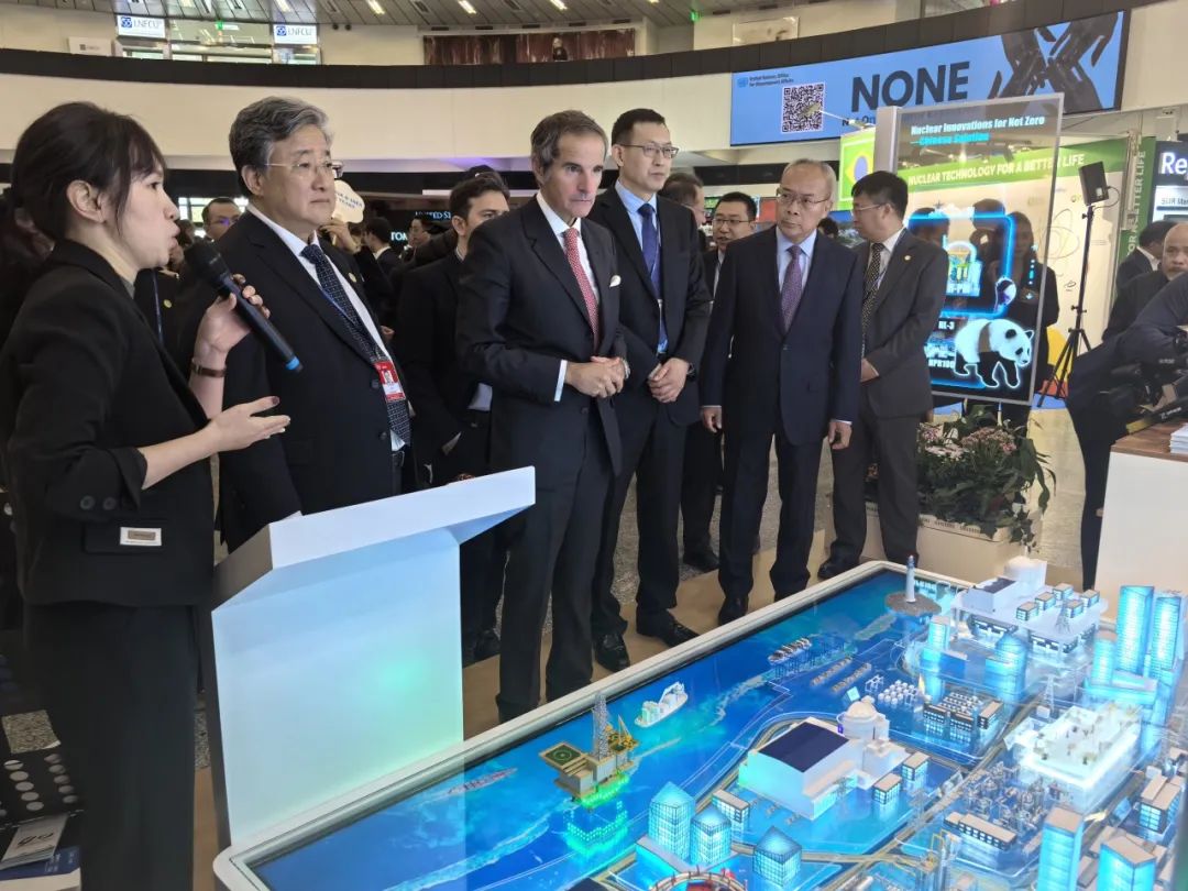 由中核集團承辦的中國加入國際原子能機構(gòu)40周年“核創(chuàng)未來、核美家園”主題展臺吸引了全球同行的關(guān)注。在“核創(chuàng)未來、核美家園”主題展臺前,余劍鋒接待了國際原子能機構(gòu)總干事格羅西、國家核安全局局長董保同、中國國家原子能機構(gòu)副主任劉敬、中國常駐國際原子能機構(gòu)代表李松大使等重要嘉賓,體驗中國傳統(tǒng)非遺拓印,共同在紙扇上拓印出“CHINA & IAEA 40 YEARS”“核美家園”。還有來自法國、沙特、約旦、土耳其、塞爾維亞、泰國、剛果等多個國家重要嘉賓參觀展臺。
