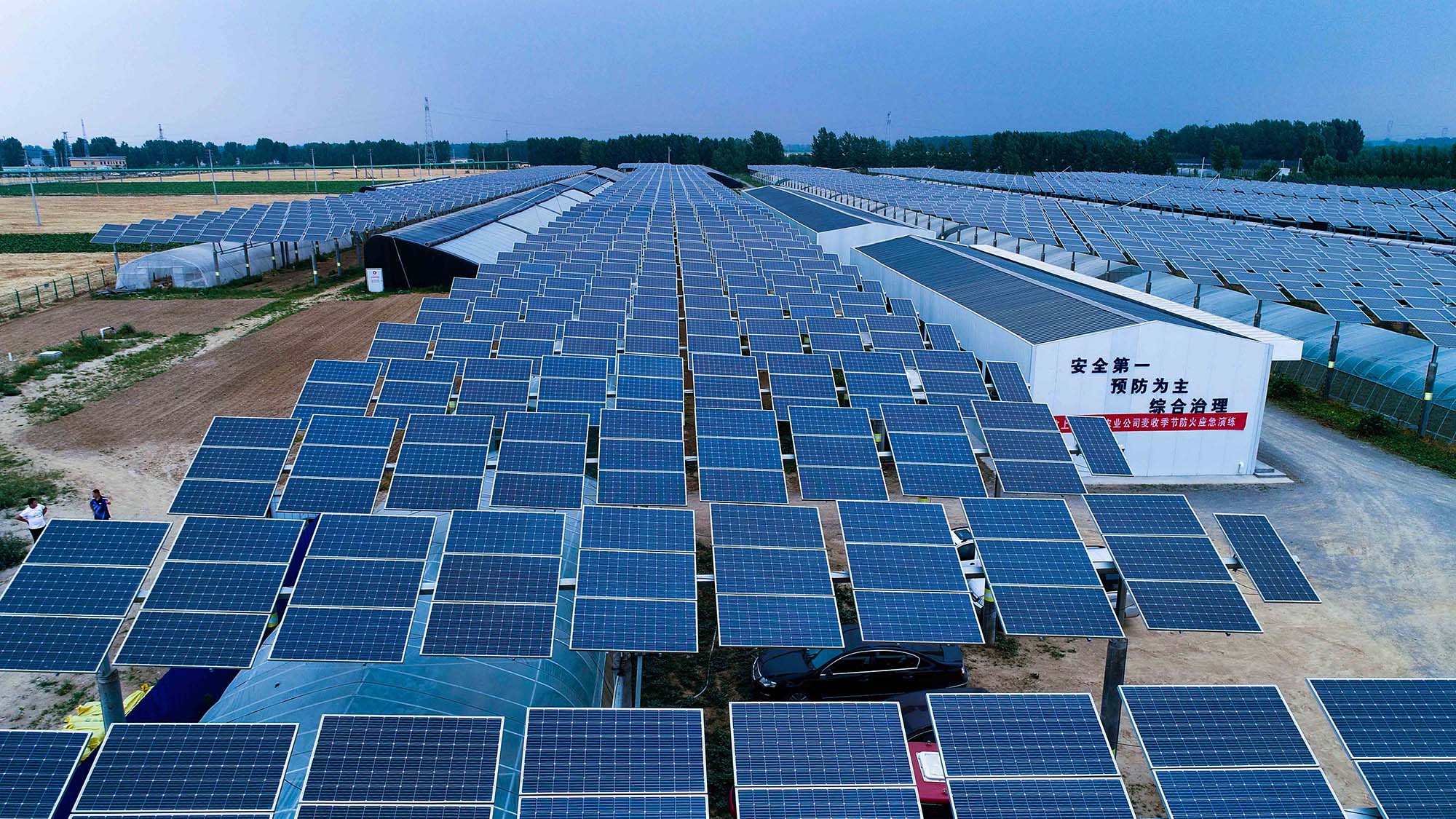 隨風(fēng)轉(zhuǎn)動的巨大葉片,聳入云天的筆直塔架,金色陽光灑在沿坡而建的排排蔚藍(lán)色太陽能電池板上……