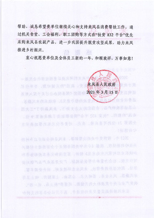 2021年4月22日,大唐海勃灣水利樞紐公司收到來自湖北省來鳳縣人民政府的感謝信,對大唐海勃灣水利樞紐公司無私的幫助表示衷心的感謝。