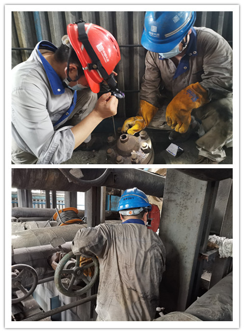 維護部:副主任與檢修人員一起檢查閥門損壞原因;綜合班副班長正在焊接3號機汽包加藥管逆止門