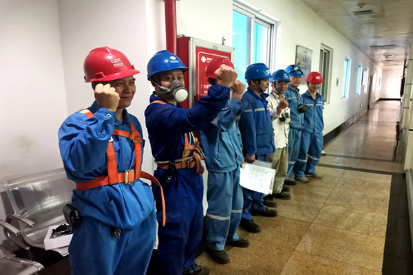 集控室走廊,該公司檢修部和拓奇項(xiàng)目部鍋爐檢修人員用堅(jiān)守?fù)纹鹱顮N爛的笑容。他們嚴(yán)陣以待,待壓力到位保壓后進(jìn)行系統(tǒng)全面檢查工作,為6號(hào)鍋爐水壓試驗(yàn)作好準(zhǔn)備。