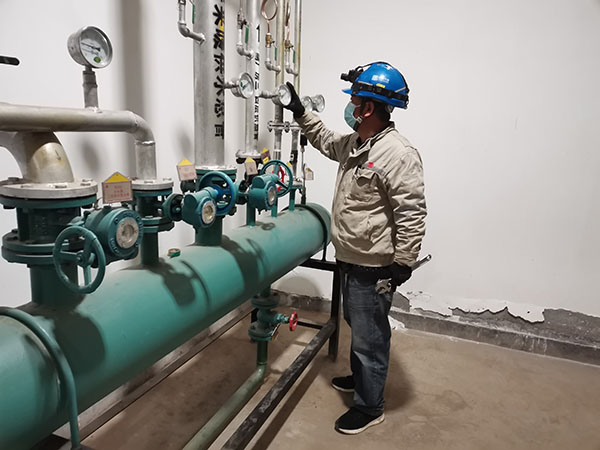 團員青年檢查換熱站供熱管路壓力表