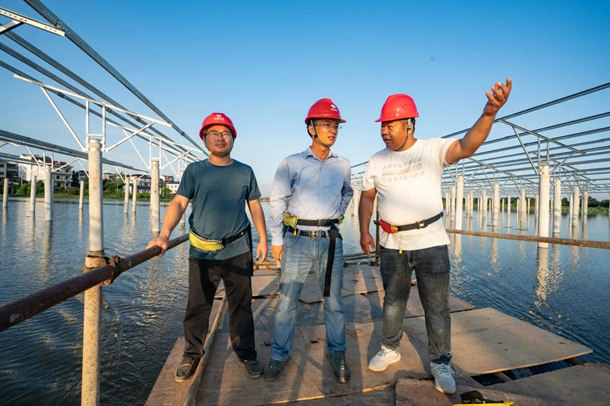 “從乘浮船‘踩點(diǎn)’開(kāi)始,工作盡量提前,凡事親力親為,特別是三伏天后天氣超熱,我們避開(kāi)最熱時(shí)段,早上4點(diǎn)就到現(xiàn)場(chǎng),業(yè)主心疼我,我心疼工友,工友自然干勁足。打樁效率、質(zhì)量直接關(guān)系到后續(xù)光伏面板安裝進(jìn)度和全容量并網(wǎng)任務(wù),不打好提前量,對(duì)不起業(yè)主方的信任厚愛(ài)……”,7月16日,茶從湖標(biāo)段已打完4800余根樁基,完成80%以上的任務(wù),光伏面板安裝進(jìn)度超20%。8月15日再找他時(shí),早已在江埠項(xiàng)目堯咀光伏區(qū)鏖戰(zhàn)了。