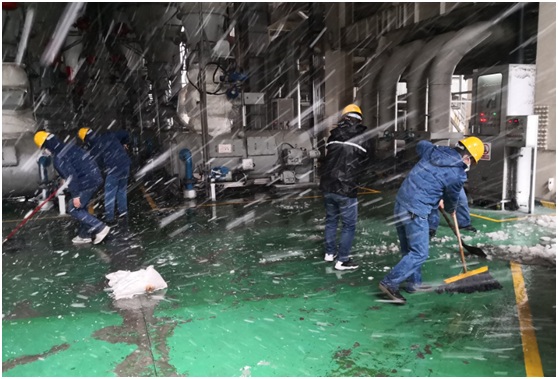 早在幾天前,一收到市氣象局發(fā)布的大雪預(yù)警信息后,楊坤就帶領(lǐng)著六值班組成員進(jìn)行相關(guān)重點區(qū)域的學(xué)習(xí)和操作。工作開始前,楊坤再三叮囑值內(nèi)成員要采取好防護(hù)保暖措施,預(yù)防風(fēng)寒感冒。大雪襲來后,楊坤第一時間帶領(lǐng)值內(nèi)成員在部門統(tǒng)籌安排下,前往生產(chǎn)現(xiàn)場清雪、撒鹽、鋪設(shè)防滑袋等相關(guān)安全保障措施。風(fēng)雪中,楊坤拿來了幾個大鐵鍬,在鍋爐12米的給煤機(jī)平臺上將凍上的冰面一片片敲裂,然后再順著雪一道鏟到通道的兩旁,最后撒上鹽,在相關(guān)區(qū)域鋪上麻袋。有人問他怎么做得這么熟練,他笑著說自己打小在東北的家鄉(xiāng)就干這些事。