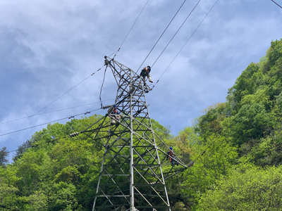 此次維保檢修的二郎壩發(fā)電35kV臥天架空輸配電線路全長約18公里,共有桿塔43級(jí),其中鐵塔22級(jí),混凝土水泥桿塔21級(jí),均為山區(qū)架空線路,且位于陜南山區(qū),叢林密布、道路濕滑,檢修維保工作難度大。施工前,電力運(yùn)營提前抽調(diào)專業(yè)技術(shù)人員對(duì)現(xiàn)場(chǎng)情況進(jìn)行實(shí)地勘察,就天氣情況、檢修方案、危險(xiǎn)點(diǎn)進(jìn)行分析討論,梳理設(shè)備缺陷隱患,并制定了完善的檢修方案及“三措兩案”。檢修人員披荊斬棘、逐桿逐級(jí)檢修,共計(jì)消除桿塔金具缺陷339條、更換破損絕緣子5片、更換避雷器1組,有效地提高了輸電線路設(shè)備的健康和運(yùn)行水平,以優(yōu)質(zhì)、高效的檢修成果確保了業(yè)主方輸電線路安全可靠運(yùn)行。