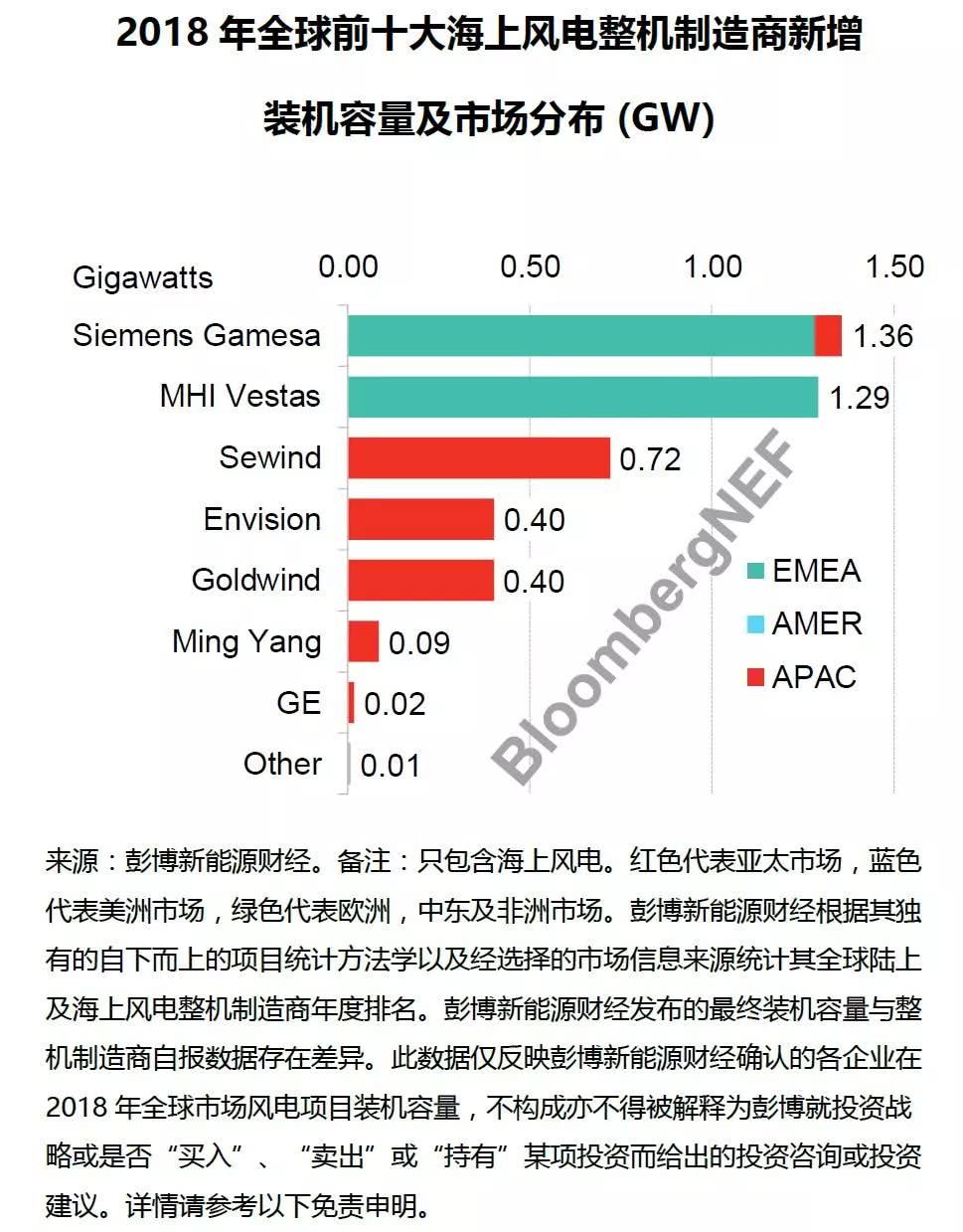 Siemens Gamesa2018年全球海上風(fēng)電新增裝機容量為1.36GW,市場份額達(dá)32%,繼續(xù)領(lǐng)跑全球海上風(fēng)電市場。