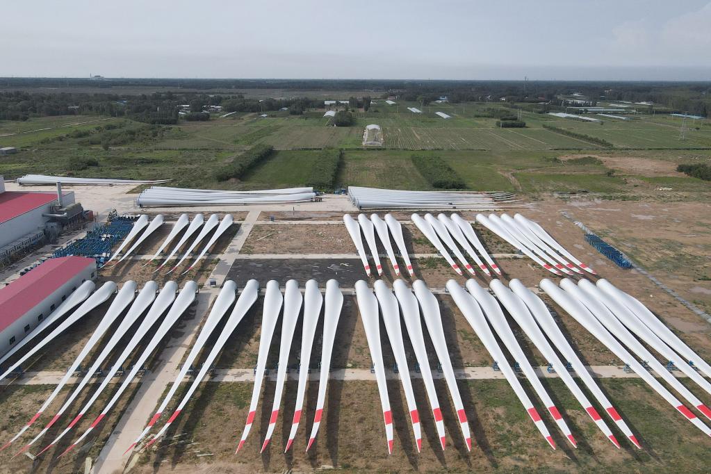 6月30日拍攝的河北省威縣一家風(fēng)電機組葉片制造企業(yè)生產(chǎn)的大型風(fēng)電機組葉片(無人機照片)。 新華社記者 駱學(xué)峰 攝