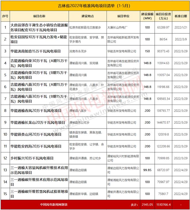 1-5月,吉林省發(fā)改委連續(xù)核準(zhǔn)批復(fù)大唐前郭查干湖生態(tài)小鎮(zhèn)綜合能源服務(wù)項目配套10萬千瓦風(fēng)電項目、、乾安縣國綜10萬千瓦風(fēng)力發(fā)電+儲能項目、華能洮南如意15萬千瓦風(fēng)電項目等15個風(fēng)電項目,規(guī)模共計2145.05MW,總投資超151億元。其中三一獲核準(zhǔn)299.85MW,華能獲核準(zhǔn)1545.2MW。