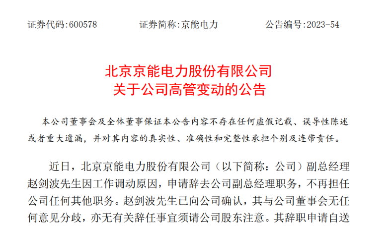 11月18日,北京京能電力股份有限公司(以下簡稱“京能電力”或“公司”)發(fā)布《關于公司高管變動的公告》。