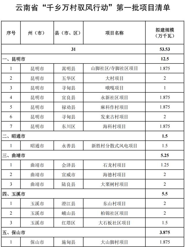 為持續(xù)打造綠色能源強(qiáng)省、大力發(fā)展新能源、助力鄉(xiāng)村振興,云南近日發(fā)布《“千鄉(xiāng)萬村馭風(fēng)行動”第一批項(xiàng)目開發(fā)建設(shè)方案》(以下簡稱《方案》),將開發(fā)建設(shè)第一批共31個風(fēng)電項(xiàng)目,裝機(jī)容量53.53萬千瓦。