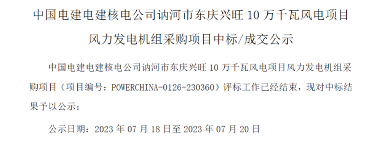 7月18日,中國(guó)電建集中采購平臺(tái)發(fā)布《中國(guó)電建電建核電公司訥河市東慶興旺10萬千瓦風(fēng)電項(xiàng)目風(fēng)力發(fā)電機(jī)組采購項(xiàng)目中標(biāo)/成交公示》的公告。