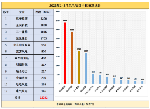 據每日風電統計,2023年1-2月,59個風電項目的中標情況顯示,已開標項目總規(guī)模達12282MW,涉及12家整機商。
