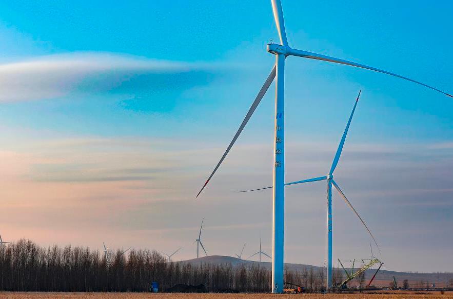 2022年12月27日,施工人員在華能突泉30萬千瓦風(fēng)電項(xiàng)目建設(shè)現(xiàn)場吊裝最后一臺風(fēng)電組件。