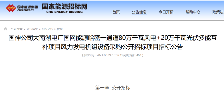 公告顯示,國網(wǎng)能源哈密一通道80萬千瓦風(fēng)電+20萬千瓦光伏多能互補(bǔ)項目場址位于新疆哈密大南湖地區(qū),工程場址中心距哈密市直線距離約96km,呈不規(guī)則多邊形,占地面積約165.05km²,風(fēng)電場擬安裝128臺6.25MW風(fēng)力發(fā)電機(jī)組,總裝機(jī)容量800MW,共分為兩個標(biāo)段:A標(biāo)段400MW,B標(biāo)段400MW。本項目計劃于2023年9月30日前開工(暫定);2024年6月30日前全容量并網(wǎng)發(fā)電。(暫定)