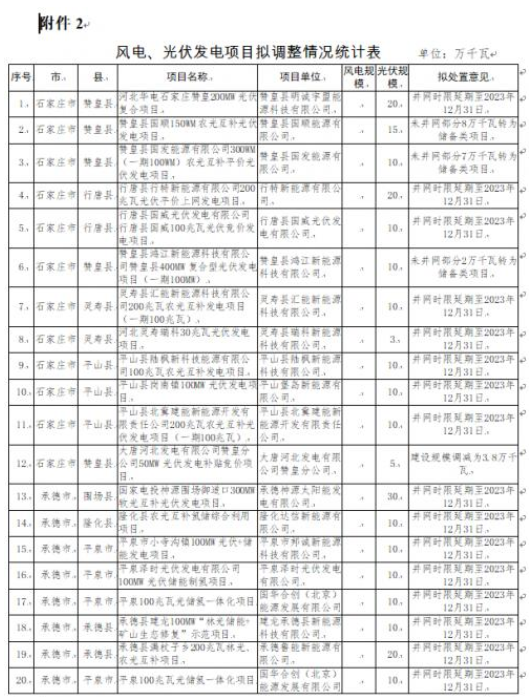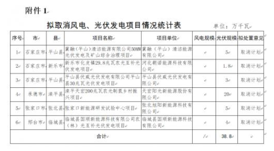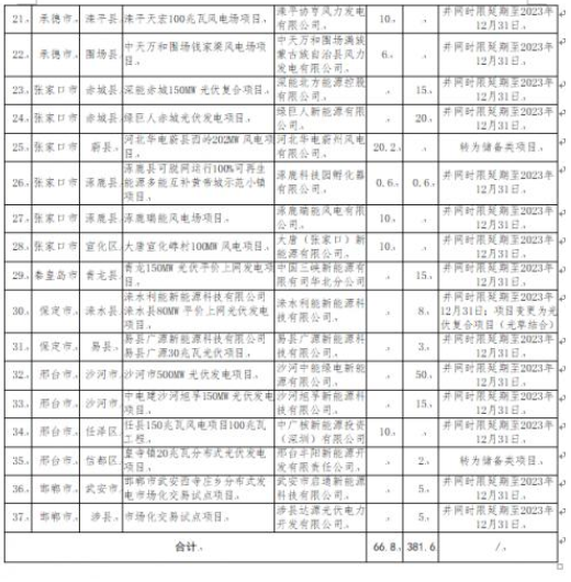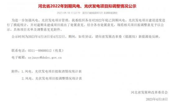 4月18日,河北省發(fā)改委對2022年到期風(fēng)電、光伏發(fā)電項目擬調(diào)整情況進(jìn)行公示。公示表示,為進(jìn)一步加強風(fēng)電、光伏發(fā)電項目管理,對2022年底已到期風(fēng)電、光伏發(fā)電項目建設(shè)進(jìn)度進(jìn)行了摸底統(tǒng)計,并對逾期未建成項目提出了處置意見。其中,擬取消8個風(fēng)電、光伏發(fā)電項目,規(guī)模合計388MW;風(fēng)電、光伏發(fā)電項目擬調(diào)整37個,規(guī)模合計4484MW,其中,光伏項目3816MW。