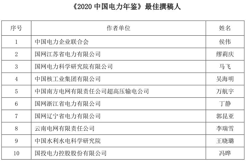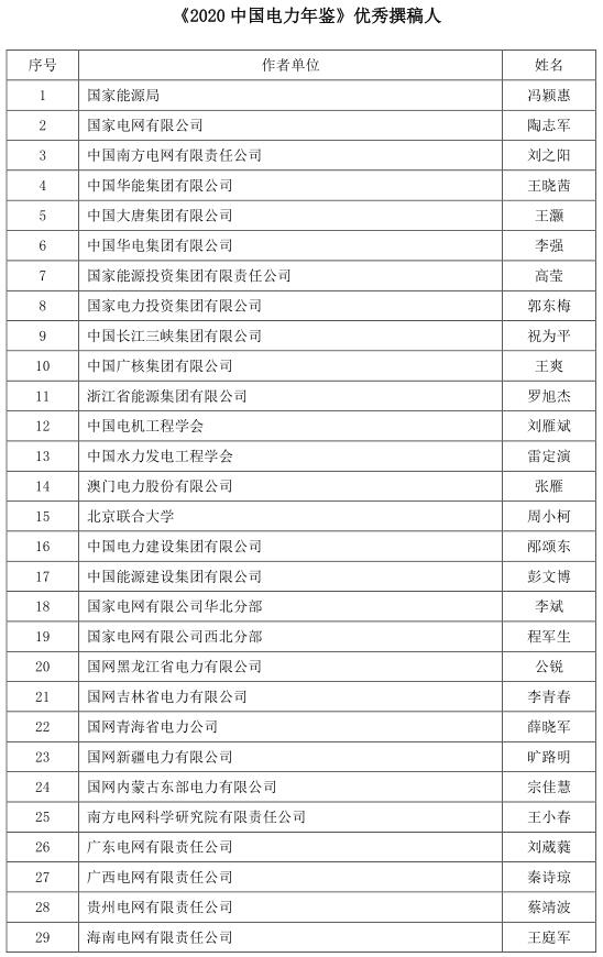 為促進(jìn)《年鑒》編撰質(zhì)量的進(jìn)一步提升,表彰在年鑒編撰工作中表現(xiàn)突出的先進(jìn)個(gè)人,根據(jù)《<中國電力年鑒>優(yōu)秀撰稿人評(píng)獎(jiǎng)辦法(試行)》,經(jīng)年鑒編輯部初評(píng)、評(píng)選委員會(huì)審核,評(píng)選出《2020中國電力年鑒》最佳撰稿人和優(yōu)秀撰稿人,現(xiàn)將名單予以公示。