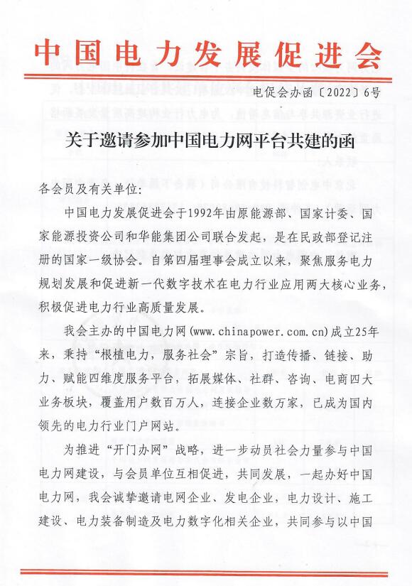 關(guān)于邀請參加中國電力網(wǎng)平臺共建的函