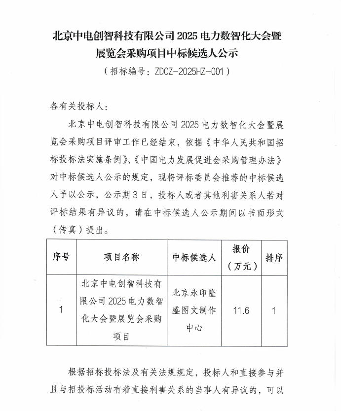 北京中電創(chuàng)智科技有限公司2025電力數(shù)智化大會(huì)暨展覽會(huì)采購(gòu)項(xiàng)目中標(biāo)候選人公示