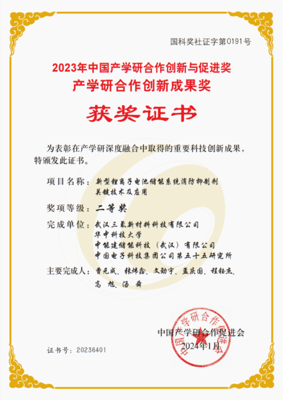 近日,第十五屆中國產(chǎn)學(xué)研合作創(chuàng)新大會在北京舉行。中能建儲能科技(武漢)有限公司與武漢三氟新材料科技有限公司、華中科技大學(xué)、中國電子科技集團公司第五十五研究所等單位合作的“新型鋰離子電池儲能系統(tǒng)消防抑制劑關(guān)鍵技術(shù)及應(yīng)用”榮獲2023年中國產(chǎn)學(xué)研合作創(chuàng)新與促進獎–產(chǎn)學(xué)研合作創(chuàng)新成果獎二等獎。
