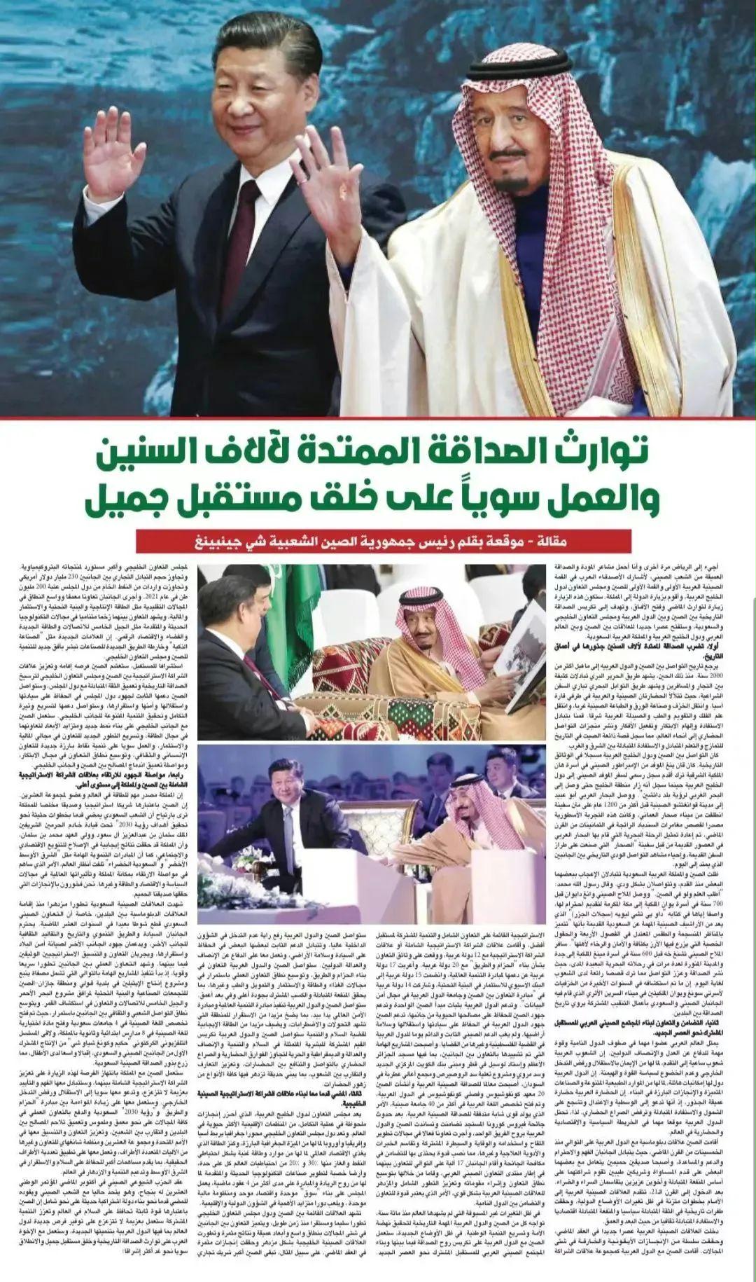 12月8日,在抵達(dá)利雅得出席首屆中國(guó)-阿拉伯國(guó)家峰會(huì)、中國(guó)-海灣阿拉伯國(guó)家合作委員會(huì)峰會(huì)并對(duì)沙特進(jìn)行國(guó)事訪問(wèn)之際,國(guó)家主席習(xí)近平在沙特《利雅得報(bào)》發(fā)表題為《傳承千年友好,共創(chuàng)美好未來(lái)》的署名文章。