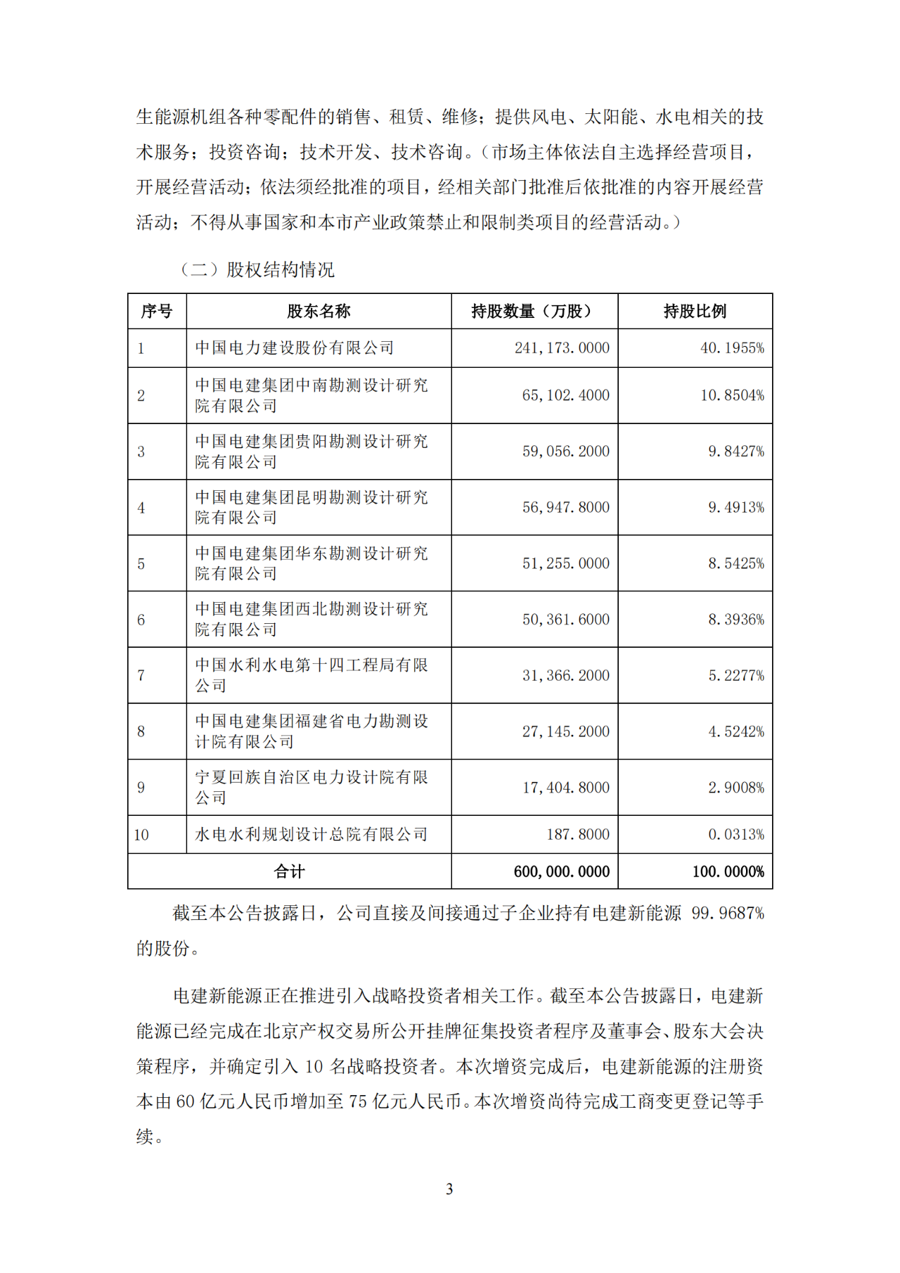目前,電建新能源正在推進(jìn)引入戰(zhàn)略投資者相關(guān)工作。截至本公告披露日,電建新能源已經(jīng)完成在北京產(chǎn)權(quán)交易所公開掛牌征集投資者程序及董事會、股東大會決策程序,并確定引入10名戰(zhàn)略投資者。本次增資完成后,電建新能源的注冊資本由60億元人民幣增加至75億元人民幣。