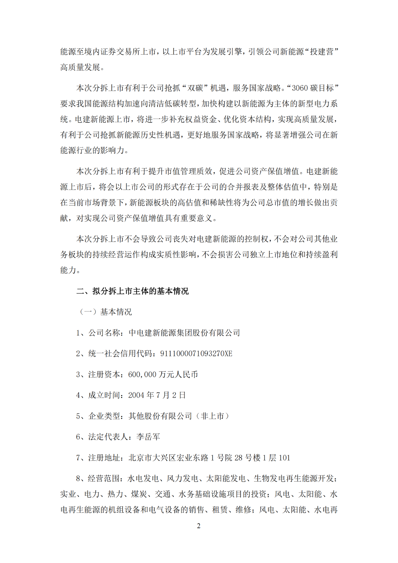 根據(jù)公告,擬拆分的中電建新能源集團(tuán)股份有限公司注冊資本為60億元,經(jīng)營范圍包括水電發(fā)電、風(fēng)力發(fā)電、太陽能發(fā)電、生物發(fā)電再生能源開發(fā)等。