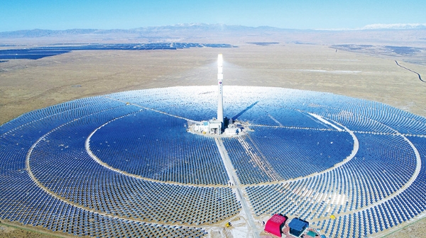 青海共和熔鹽塔式光熱電站是國家首批20個(gè)光熱示范項(xiàng)目之一,該項(xiàng)目有力地推動(dòng)和促進(jìn)了國內(nèi)光熱產(chǎn)業(yè)的發(fā)展。圖為青海共和熔鹽塔式光熱電站。 中國電建供圖 李強(qiáng)/攝
