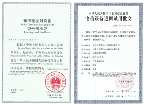 根據(jù)國家規(guī)定,所有在中國境內(nèi)生產(chǎn)的無線電發(fā)射設(shè)備,均須持有經(jīng)國家無線電管理委員會對其發(fā)射特性進(jìn)行型號核準(zhǔn)后核發(fā)的無線電發(fā)射設(shè)備型號核準(zhǔn)證,是與3C質(zhì)量認(rèn)證一樣的國家強(qiáng)制認(rèn)證。同時,國家規(guī)定在中國境內(nèi)銷售的無線電發(fā)射設(shè)備,還必須通過進(jìn)網(wǎng)許可核準(zhǔn),才能接入5G等公用電信網(wǎng)以及在國內(nèi)銷售。至此,電力5G增強(qiáng)型通信終端成為國內(nèi)電力行業(yè)同時獲得型號核準(zhǔn)證和進(jìn)網(wǎng)許可證的5G通信終端,使其在電網(wǎng)規(guī)模應(yīng)用取得“合法身份”。